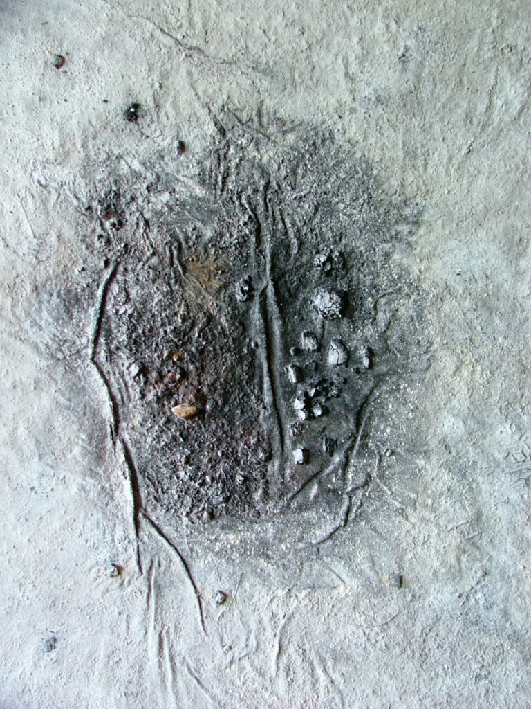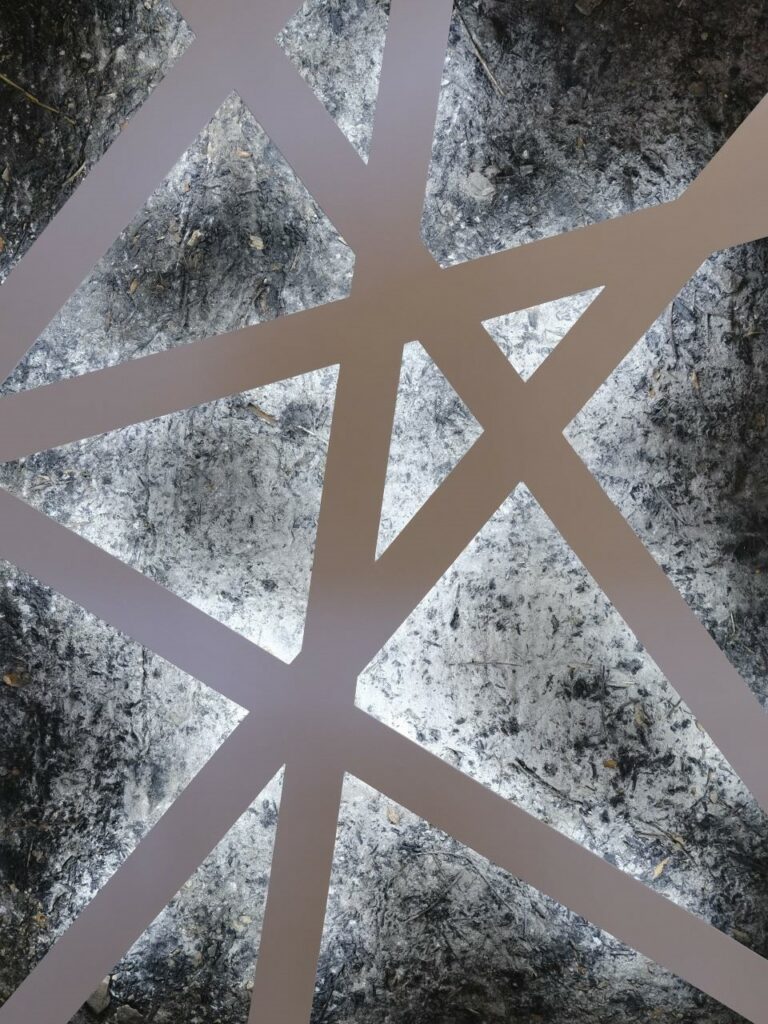 – contraste de forme entre la matière (l’empreinte des restes d’un feu) et le travail plus conceptuel (les lignes sécantes) assimilé à l’esprit.