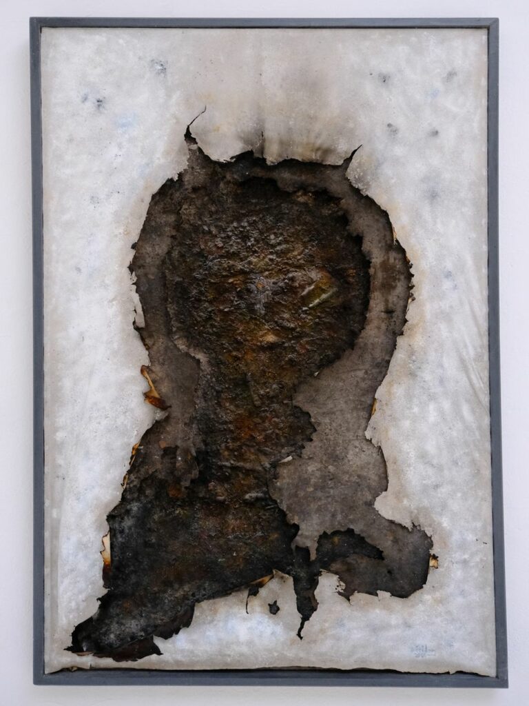 Le feu comme la rouille est un processus de destruction naturel. Il contient aussi le paradoxe de la vie et de la mort, de l’obscurité et de la lumière, du noir et de la couleur. Ainsi, l’artiste limite son intervention au prélèvement de la matière, directement sur le sol (des empreintes de restes de feu aux dessins sont aléatoires et représentant le corps), à l’ajout de pigments de couleur (matérialisant l’esprit) et à la présentation de la toile à la verticale, ce qui altère la position naturelle du feu; la perception du regardeur s’en trouve modifiée.