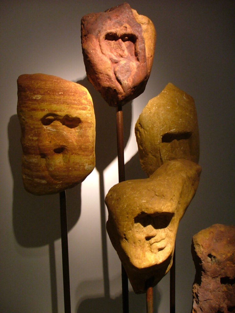 Dans ses premiers travaux de sculpture, Eric Béridon minimise volontairement son intervention à un travail en creux des pierres et à leur assemblage avec le métal pour laisser à la nature et à la matière leur pouvoir créatif. Les pierres viennent du Vaucluse, de la région des ocres et sont associées à des métaux oxydés. Pierres et métaux ont une origine commune : l’oxydation, représentative du temps qui passe, de la vieillesse, de la mort. La lumière naturelle révèle des visages en creux comme des âmes fossilisées, matérialisant l’intemporel. La matière intervient autant que l’artiste dans le processus de création.